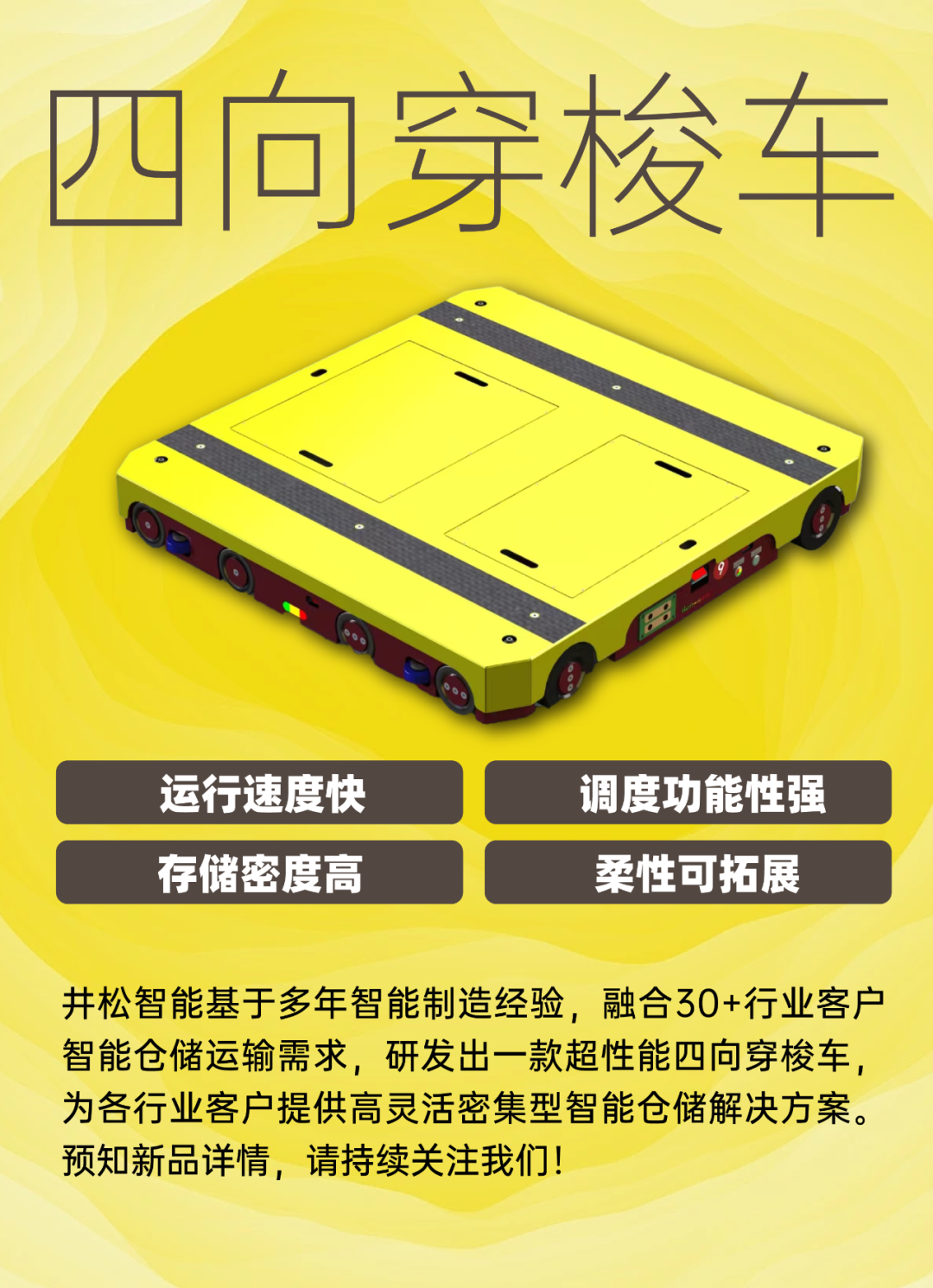 四向穿梭车具备多重应用优势。四向车具有速度快、载荷重、行驶稳、定位准的特点,纵横向移动的设定,使单台设备可到达任一货位(或输送地点)取放货,配合输送线、提升机、货架等设备,可达到客户需要的取放高度。四向车适用于各种仓库、场景广泛。
