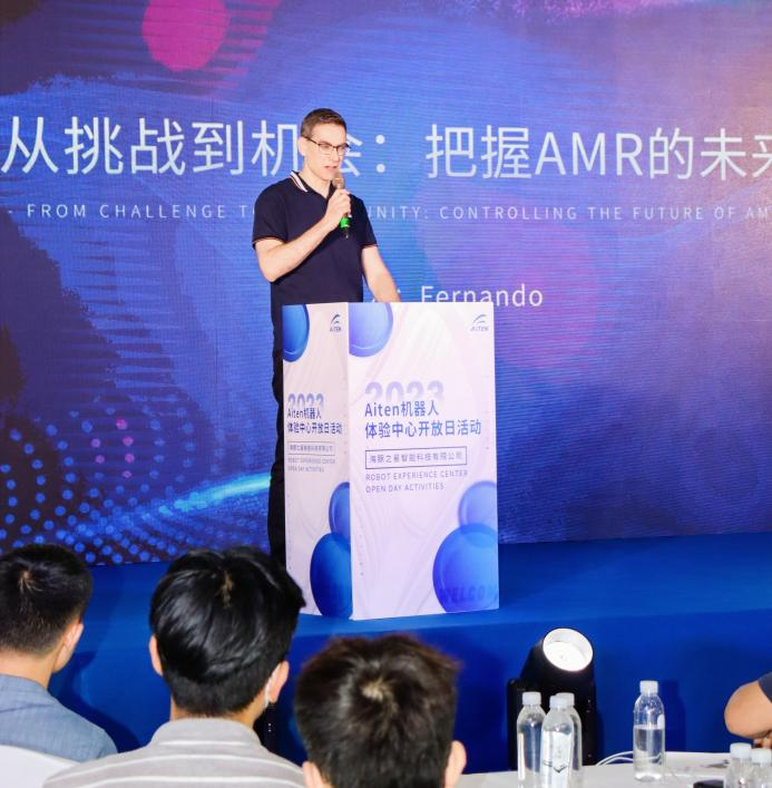 开放日活动下午2点30分在苏州海豚之星智能科技有限公司苏州运营总部准时开始,首席运营官 Fernando先生率先致欢迎词并做主题《从挑战到机会:把握AMR的未来》的演讲。他分享了全球和中国内部物流市场中移动机器人销售增长的最新数据。提到尽管疫情带来了挑战,但全球移动机器人市场仍然保持稳健增长,而中国市场更是展现出强劲需求和巨大潜力。强调经销商朋友在海豚产品推广和销售中的重要角色,对他们的努力和奉献表示感谢!他说公司为客户提供优质服务,追踪客户反馈以不断改进产品和服务。他鼓励经销商们继续合作,抓住增长机遇,迎接移动机器人市场带来的挑战。