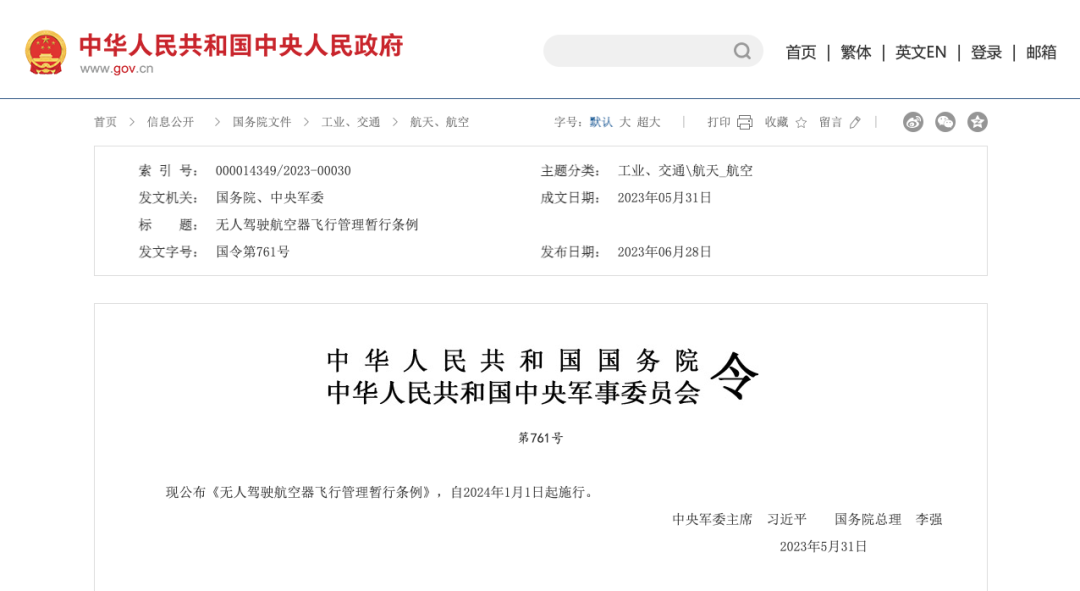 《无人驾驶航空器飞行管理暂行条例》公布, 2024年1月1日起施行