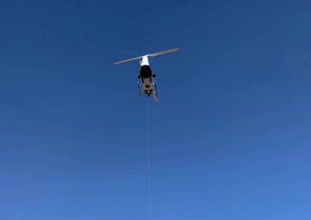 该直升机拥有自主设计的物料接地挂钩、脱钩方式,在开展吊运作业时,由地面装载手将完成打捆并放置于地面的电力物资挂放于长绳吊索末端挂钩。在投放点,直升机借助精准投放装置,可根据物资触地后的受力变化自动完成脱钩摆放,在续航时间内保持不间断运输作业,避免因降落带来的启停设备工期消耗,较传统吊运方式提高3倍以上效率。