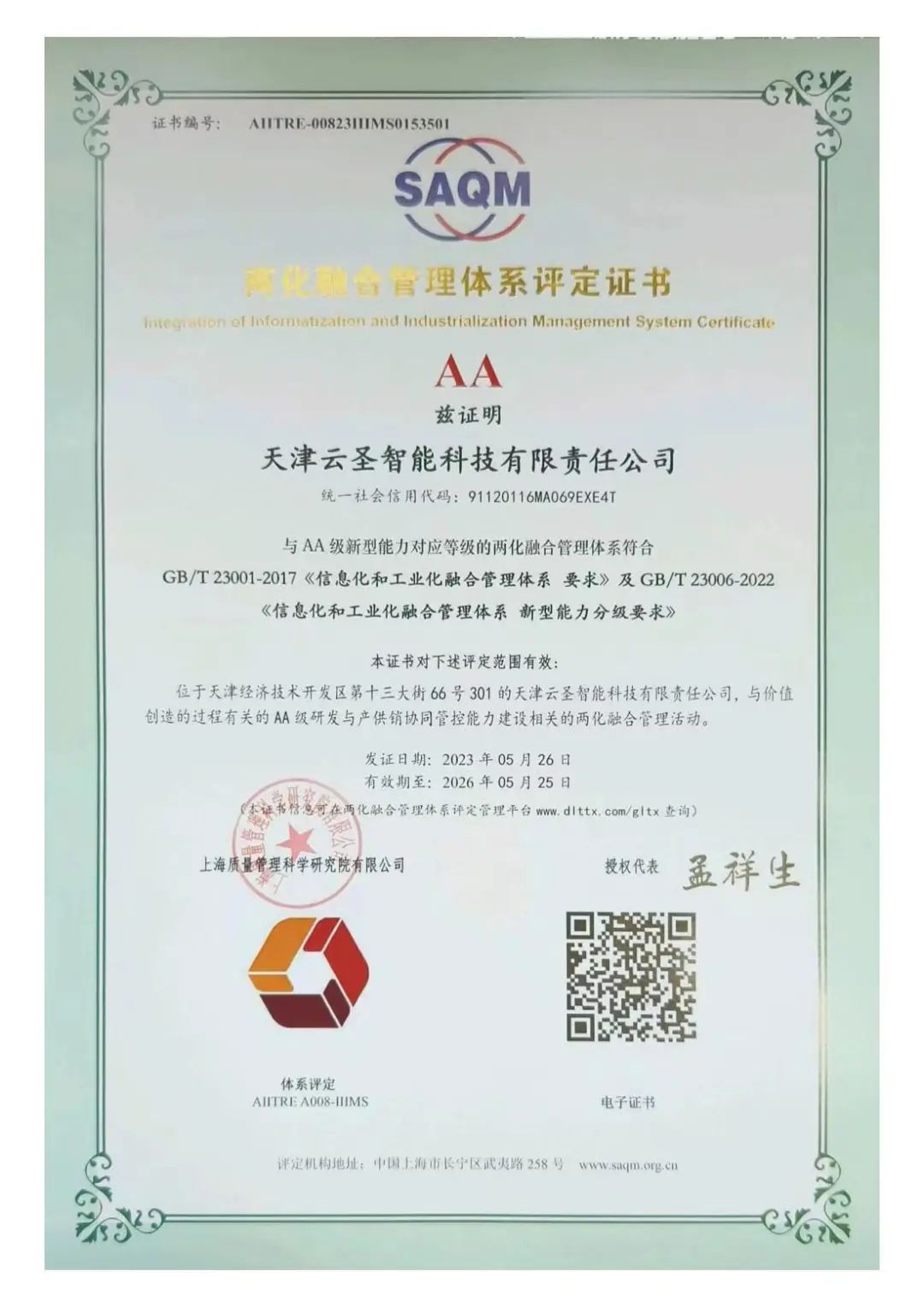 随着科技的飞速发展和全球经济一体化的深入推进,企业面临着日益激烈的市场竞争。在这个大背景下,如何实现企业的可持续发展和转型升级成为了许多企业管理者关注的焦点。而“两化融合”(信息化与工业化的深度融合)作为一种全新的管理模式,正逐渐受到越来越多企业的青睐。它不仅包括了信息技术在制造业中的应用,还包括了生产、管理、服务等各个环节的数字化改造。作为一家具有前瞻性思维的企业,公司深知两化融合对企业的重要性。近日,云圣智能也成功通过了GBT23001-2017及GBT23006-2022两化融合AA级管理体系认证。