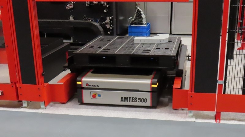 7月12日,日本钣金加工机械制造商Amada在东京“MF-TOKYO 2023”展览会会场发布了自主移动运输机器人(AMR)“AMTES 500”。