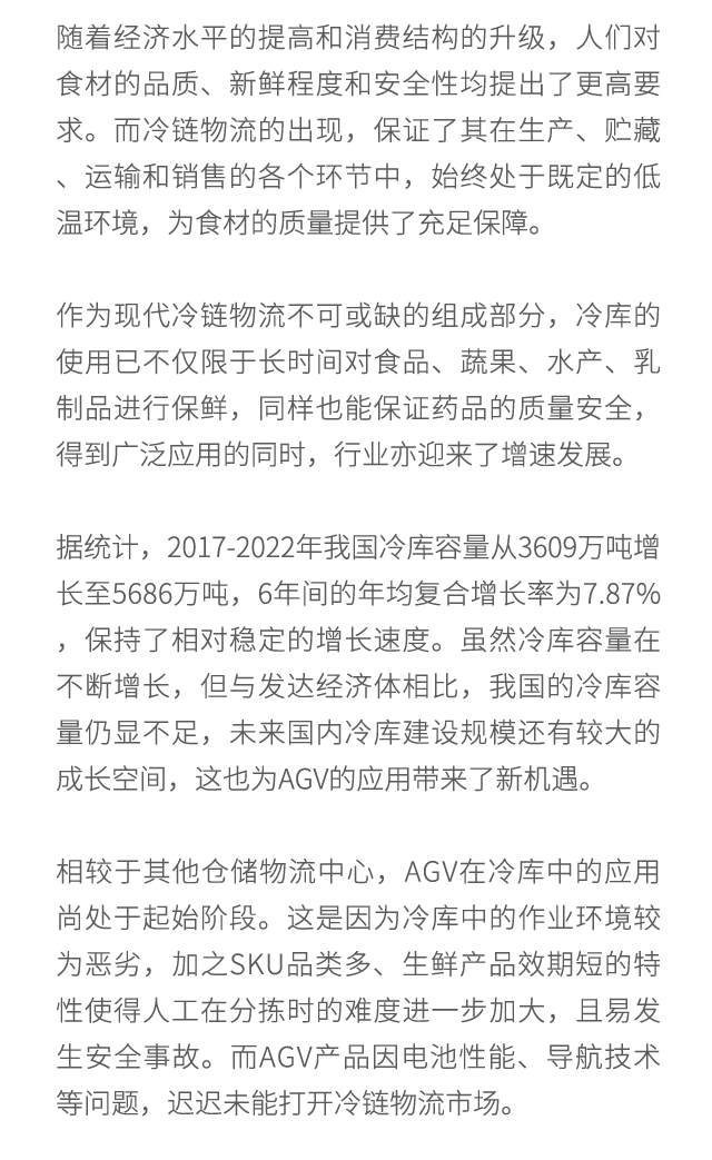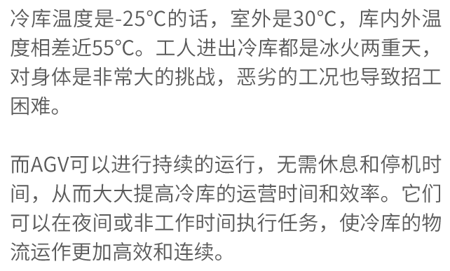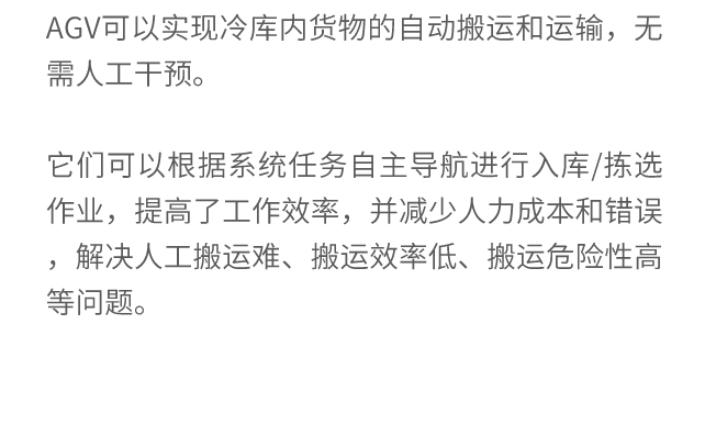 × 低温冷库项目的落地,彰显了AGV在低温环境中运行的潜力。这既是科尔摩根与嘉腾精诚合作下的有益尝试,也为AGV如何克服极端环境的平稳运行提供了样例参考,相信随着冷链基础设施政策的引导和企业布局完善,未来将会有更多的AGV出现在冷库物流的场景中。