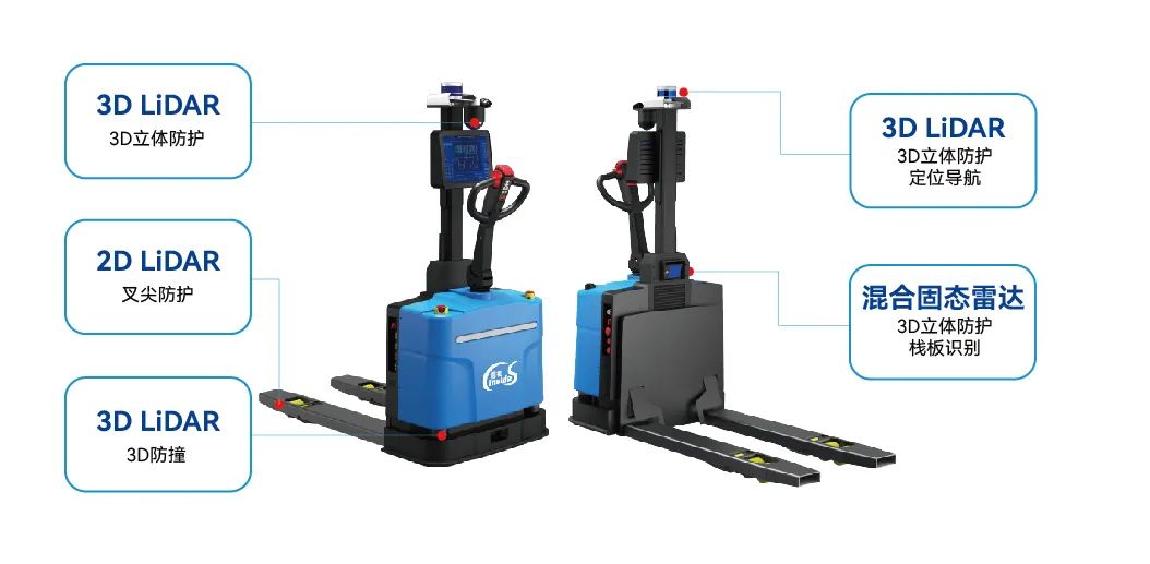 随着仓储自动化的演进,部分传统叉车逐渐被无人叉车取代,无人叉车制造商通常会在车体上安装一些传感器充当它的“眼睛”,帮助叉车识别路况信息,弥补传统叉车安全性低的痛点。 然而,市面上多数无人叉车制造商通常只在叉车最顶端安装一颗用于导航定位和探测周边障碍物的激光雷达,由于视场角的限制,车体周身的低矮处仍处于无法探测到的视野盲区;为探测到车体周身低矮处障碍物,同时考虑到成本问题,个别厂商还会在叉车底部两侧安装两颗单线激光雷达,然而单线激光雷达只能探测物体平面轮廓,依然存在较大探测盲区。 全方位立体安全防护 整机成本依然可控 针对目前市面上无人叉车存在的安全隐患,镭神智能多线激光雷达3D SLAM无人叉车配置了多款自研自产的高性能激光雷达,为无人叉车提供了全方位的立体感知,充分保障了极致安全作业。 镭神智能多线激光雷达3D SLAM无人叉车最高配置8颗自研自产的激光雷达用于重构三维立体环境、栈板识别以及安全防护,整机成本依然具备超强竞争力。 其中,“CH32R超广角补盲激光雷达”与“C32W大视场机械式激光雷达”是镭神智能专为各类移动机器人推出了两款专业补盲激光雷达 ,旨在为无人叉车更广阔的视野,实现三维立体防护,保障无人叉车的作业安全。 CH32R超广角补盲激光雷达 将超广角补盲激光雷达CH32R倒置于无人叉车的顶部,360°(H)x90°(V)的超大视场可充分探测到120米(在70%的反射率下)范围内的低矮物体,弥补车周的视野盲区。高达128万点/秒的点频以及0.09°的水平分辨率保障了探测的小障碍物的清晰和准确。 CH32R参数及扫描示意图 CH32R动态扫描视频 C32W 大视场机械式激光雷达 大视场机械式激光雷达C32W可以倒置在叉车底部的左右两侧,360°(H)x70°(V)的超大视场集中扫描下方120米(在70%的反射率下)范围内的低矮物体,有效探测近距离处障碍物,防止无人叉车发生碰撞。 C32W参数及扫描示意图 C32W动态扫描视频 安装以上补盲激光雷达的无人叉车在检测到障碍物时,系统会自动控制车体暂停移动,或触发三色灯以及车体喇叭进行警告,从而保障无人叉车的安全运行。 以下视频来源于 镭神 安全无小事,无人叉车的安全性并不仅仅是保护设备和货物的问题,更是确保工作环境中每个参与者的身体健康和生命安全。提升无人叉车作业的安全性,全方位规避无人叉车作业安全风险是企业高效生产与运输的前提与基础。镭神智能将持续发挥自身技术优势并融合多年实践经验与客户共同协作,打造更加安全高效的智能仓储服务。 关于镭神智能 2022年9月27日,镭神智能车规激光雷达受邀参与“奋进新时代”主题成就展,是“方寸之间”单元唯一一家激光雷达企业代表。 深圳市镭神智能系统有限公司成立于2015年2月,是一家纯内资的国家级高新技术企业,以强大的自主研发实力成为全球领先的全场景激光雷达及整体解决方案提供商,致力于打造全国产化的高性能激光雷达及行业应用方案,秉持着“让驾驶更安全,让机器更智能,让生活更美好”的使命,以高端、稳定、可靠的激光雷达环境感知技术赋能产业升级,服务覆盖自动驾驶、智慧交通、轨道交通、通用航空、机器人、智慧物流、高端安防、港口、测绘及工业自动化等十大产业生态圈,以卓而不同的感知精品为客户创造价值,立足全球构建智能感知的黄金时代。 镭神智能始终坚守“专业 · 创新 · 品质”,经过8年的努力得到了国家及省级政府的认可,荣膺2020年度国家科技进步二等奖,是国家工信部评选的新一代人工智能产业创新重点任务揭榜优胜单位,入选国家级 “专精特新”小巨人企业名单,是广东省唯一一家激光雷达工程技术研究中心。 镭神智能同时掌握了TOF时间飞行法、相位法、三角法和调频连续波等四种测量原理,并且具备1550nm及905nm车规激光雷达的量产能力,打造了齐全的激光雷达产品矩阵,并深度集成垂直产业链资源,自研自产激光雷达收发集成电路芯片、1550nm光纤激光器及十多种高功率核心器件等关键核心器件,并掌握半导体封装工艺,建立了激光雷达自动化及半自动化产线,彻底攻克我国被“卡脖子”的35项关键技术之一的激光雷达技术问题,并获《人民日报》报道。