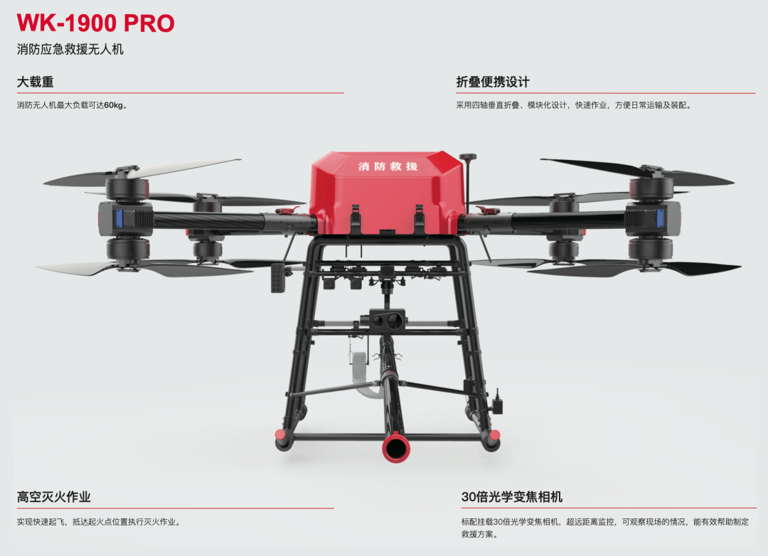 WK-1900PRO是专为消防应用设计的旗舰级无人机,支持多种灭火方式,可挂载干粉灭火器、水带、航空激光森林灭火弹。此外还支持多种应急救援装置,包括破窗器、探照灯、空中喊话器、消防物资运输箱体。