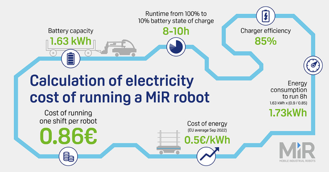 MiR 的自主移动机器人(AMR – Autonomous Mobile Robot)机体自身的低能耗主要体现在三个方面,即充电效率高、充放比高、以及运行消耗低。