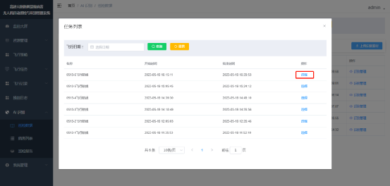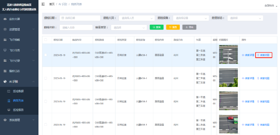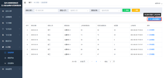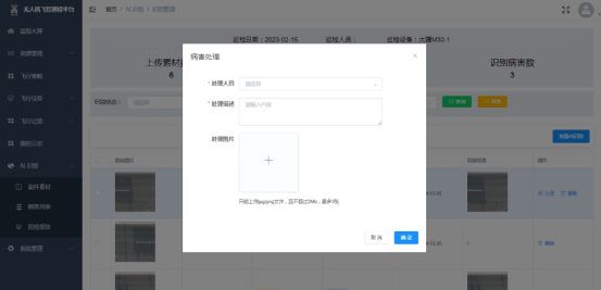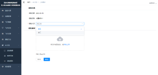 打开【AI识别】-【案件素材】菜单,进入案件素材列表页,点击上传案件素材,弹窗选择飞行记录,以确定本次上传的是哪次飞行任务的素材,选择飞行记录后跳转上传素材页,在页面选择巡检人并上传无人机采集的图片,点击确定即可完成识别素材的上传。如下图,