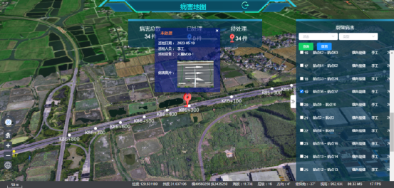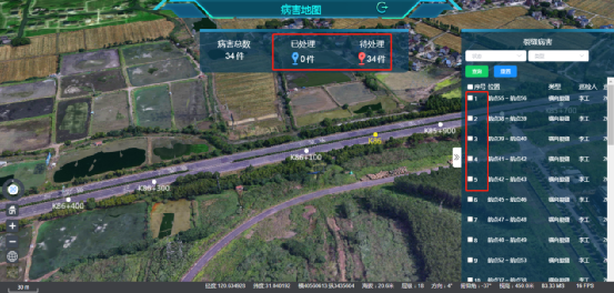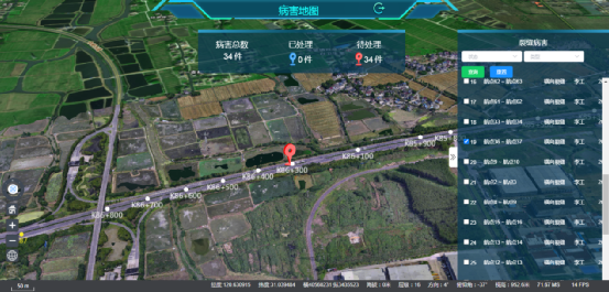 进入病害地图页后,顶部展示当前巡检记录下的已处理和待处理的病害总数,右侧栏展示当前巡检记录下的全部病害列表,选中某条即可在三维地图上显示该病害记录,并通过点击对应病害的图标可查看病害的详情情况和处理情况。如下图,