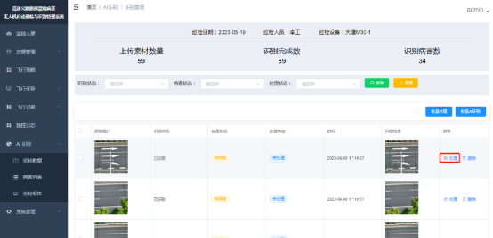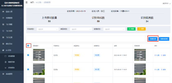 打开【AI识别】-【案件素材】菜单,进入案件素材列表页,点击识别管理,进入素材识别页面,可以选择多个图片素材点击批量AI识别进行多素材识别,也可以选择某一个图片点击操作栏的AI识别进行单图片识别,等待页面刷新识别结果即可。页面顶部会显示上传素材的总数、识别完成的素材总数和识别出的病害总数。如下图,