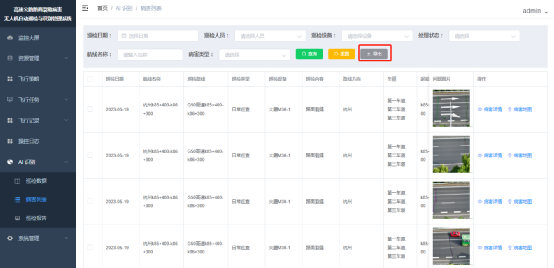 打开【AI识别】-【病害列表】菜单,进入病害列表页,根据搜索条件查询病害记录后勾选病害记录进行合并导出。如下图,