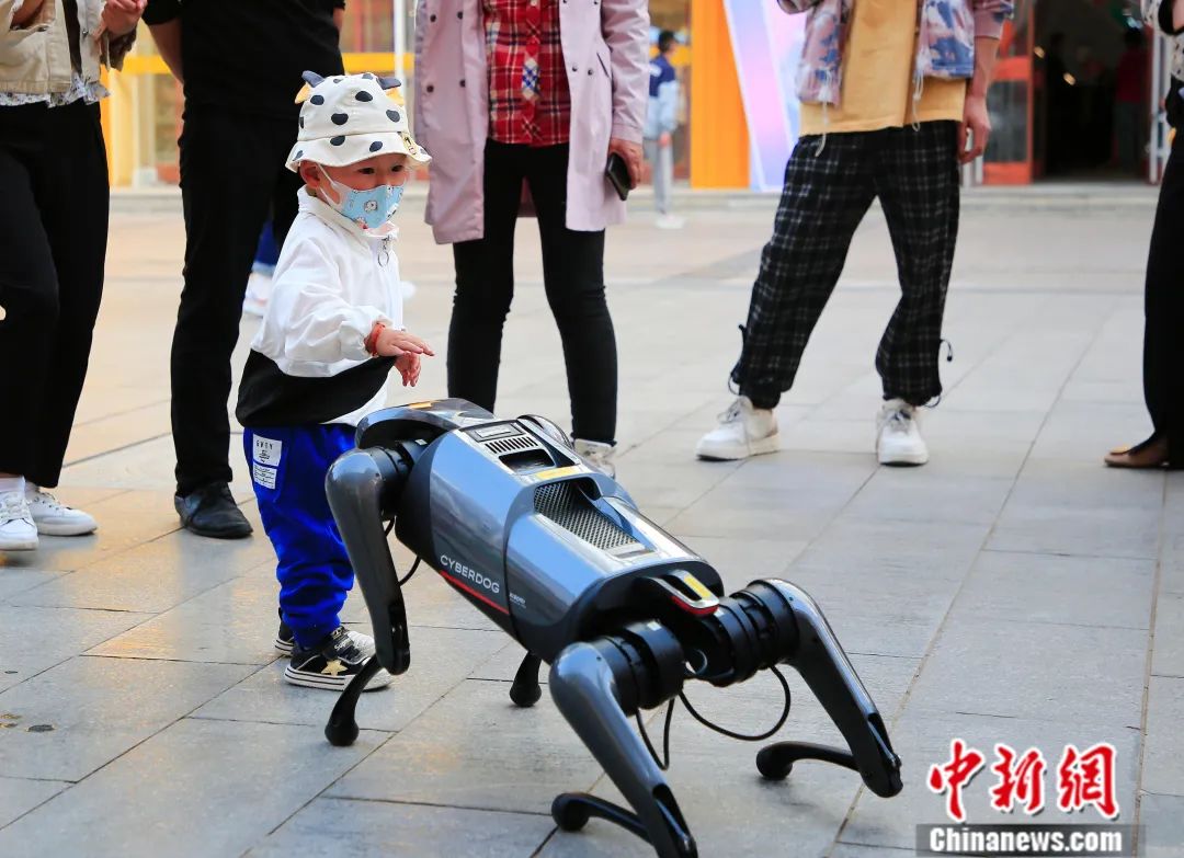 2022年4月9日,在宁夏银川鼓楼步行街,一名小朋友与机器人“铁蛋”互动。袁宏彦摄
