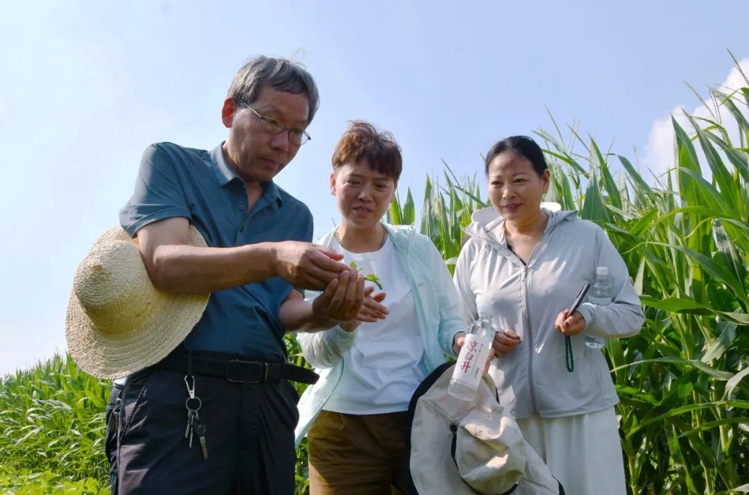 8月2日,在内埠镇内埠村千亩大豆玉米复合种植示范田里,县农业农村局高级农艺师马占宽一边现场察看病虫害发生情况,一边指导农户们科学合理预防。