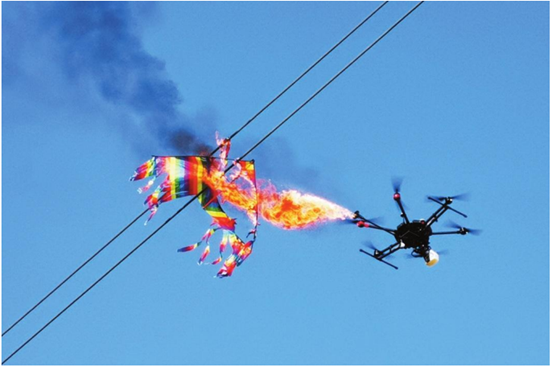 无人机携带喷火装置能快速清除导线上如气球、塑料袋、风筝及鱼线等异物。做到线路缺陷早处理。避免人员登塔处理,降低作业强度,提升供电可靠性。
