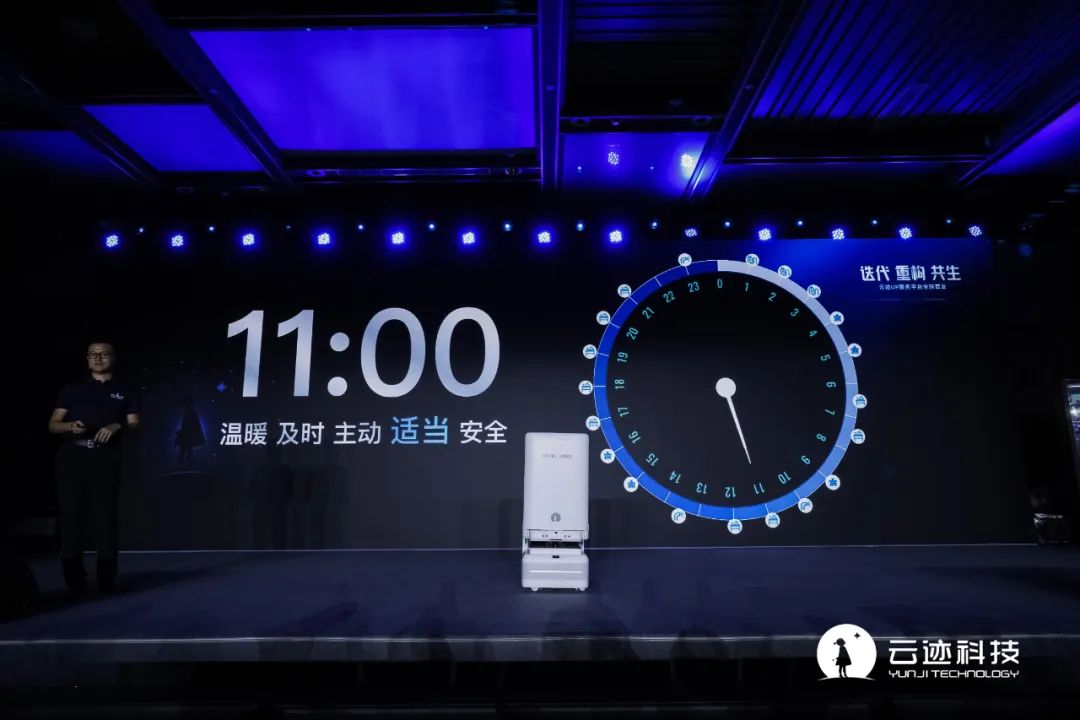 发布会现场,云迹科技CPO李全印用一场舞台剧的形式演绎了UP在“酒店的24小时”,并与元气森林、绿云、蓝豆云、TCL、乐白、赫格5家酒店智能化品牌代表,演绎酒店机器人在24小时,为客人提供的“温暖、及时、主动、适当、安全”的服务。