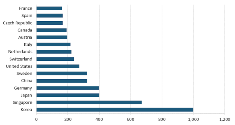 国际机器人联合会(IFR)报告了各国制造业使用机器人的数据。最新数据来自 2021 年。韩国是世界上采用工业机器人最多的国家,每 10,000 名制造业工人中就有 1,000 台机器人,新加坡以 670 台位居第二,日本和德国紧随其后,接近 400 台。