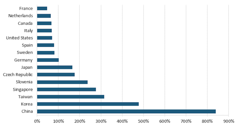 不管怎样,中国为机器人的采用提供的补贴似乎比任何其他国家都多,无论是绝对金额还是每个机器人。相比之下,美国对安装机器人没有补贴。联邦税法甚至不再允许企业在第一年出于税收目的冲销设备支出。