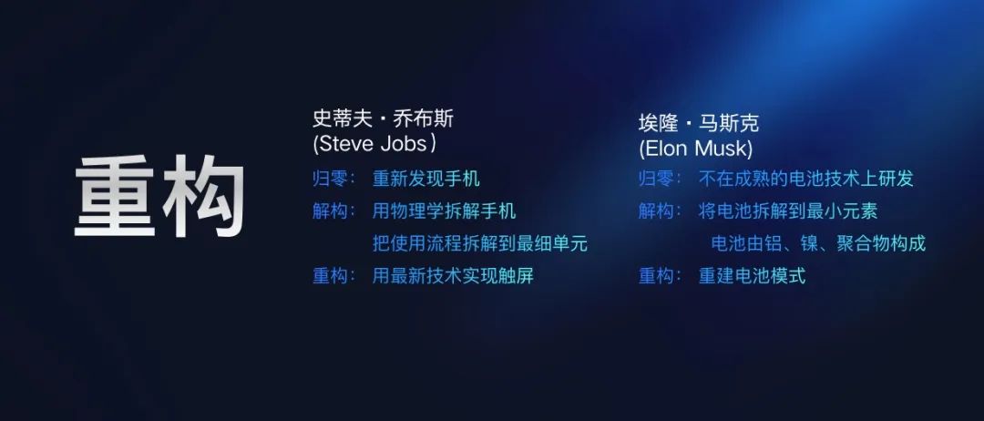 这个世界上重大的进步都发生在解构和重构中,乔布斯重新发明了手机,他没有用传统的思维去改善已有的手机,他没有把键盘做得更好,或者把手机做得更牢固,它的第一性原理是“简洁”,他用物理学把手机拆解到了最细单元,把所有客户体验流程做到了极致。