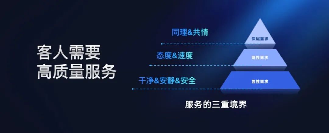 另一边,客人需要高质量的服务。“安静、干净、安全”的服务是最底层的需求,客人还需要有更好的态度,更快的速度,需要被关怀,需要温暖的同理与共情。在服务的三重境界中,太多时候显性需求没满足,隐性需求被埋没,深层需求不懂得。在这样的一个对抗里,我们酒店人可能自己也在深深的挣扎着,我希望和你们一起去突破这三重境界。