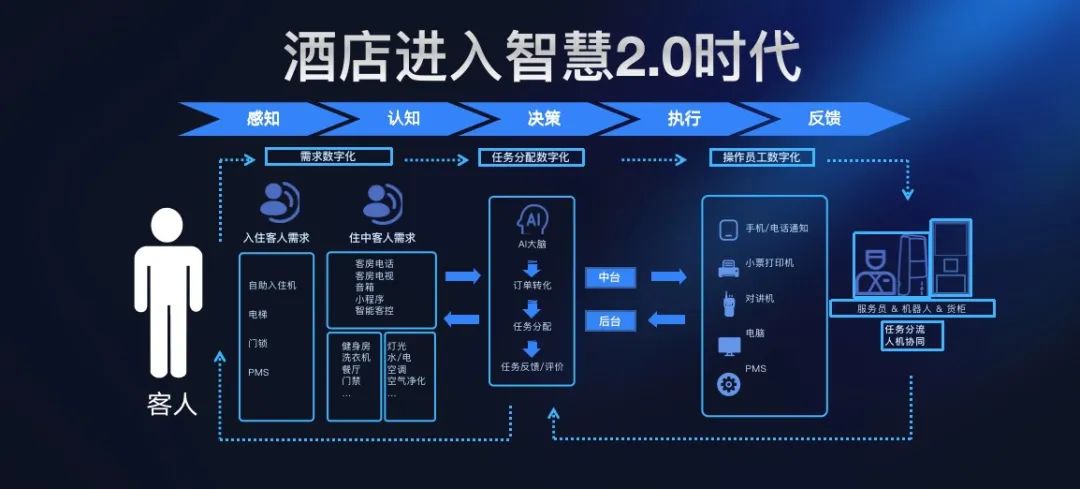 在这里,我们需要连接更多内容,后续的情景剧里,大家可以看到我们如何把酒店的所有智能设备联动起来。Ta们可以在不打扰客人、保护好客人隐私的情况下,默默的感知需求,将需求数字化传向给AI大脑,AI大脑会做出最聪明的认知和决策之后,传递给机器人和员工。在执行完成后会把执行所有的动作回馈给系统,而这一套完整的系统,我们把它叫做HDOS。
