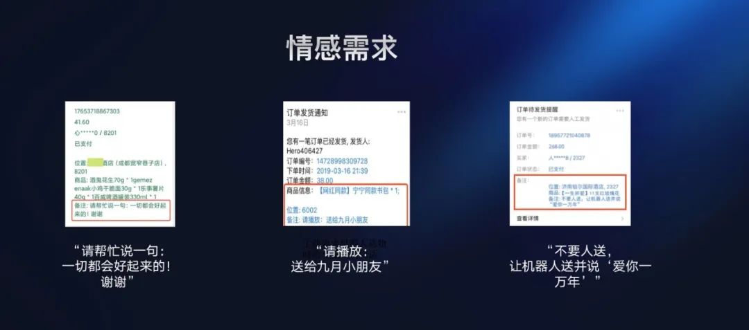 但是在这个时候,我们也发现了有很多的客人。他们在大胆的表达需求,我们不知道他买了泡面以后,还希望泡好了让机器人来送;他在要了充电器的时候,希望把蛋糕也送上来。当这些需求都被收集上来的时候,我们的“幸存者偏差”会越来越小,而深层次需求则来自于情感。