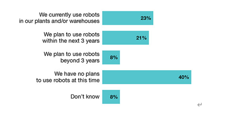为便于调查,我们将受访者分为三类:在可预见的未来没有计划使用机器人的用户;正在研究该技术并计划在未来两年内使用该技术的最终用户;以及已经在其设施中安装并运行机器人的早期用户。