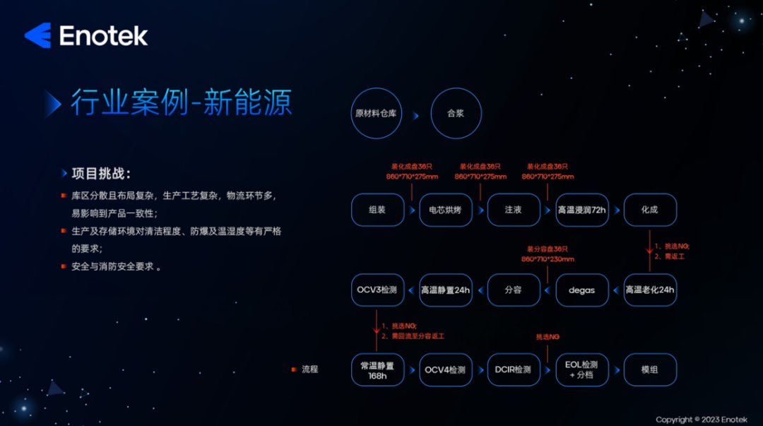 在本次演讲中,徐佳伟先生还分别就安歌科技在汽车行业与新能源领域落地的典型项目案例展开了分享。在为某新能源行业头部企业定制的智能物流项目中,安歌科技充分考虑到存储物的特殊性质,为仓库设置了防爆措施,并将仓库划分为高温库、化成库、分容库、常温静止库和成品库等5个库区,实现了对不同类型物料的科学分类管理。