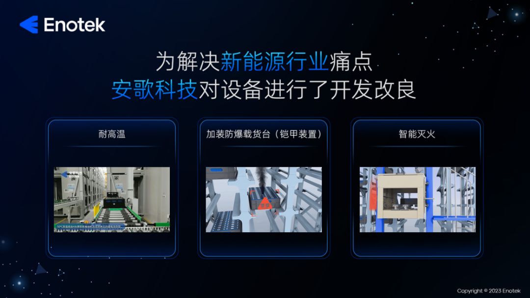 根据中国物流与采购联合会发布的数据,2023年上半年,新能源领域物流总额增速也超过了20%。针对新能源领域物流痛点,徐佳伟先生表示,主要是环境严苛、易燃易爆、消防隐患方面。针对新能源领域的特殊需求,安歌科技开发了一款具有自动灭火装置、防爆铠甲的新能源专用耐高温堆垛机。该设备能够在环境严苛、易燃易爆的条件下安全稳定地运行,为新能源行业的智慧物流提供了有力保障。