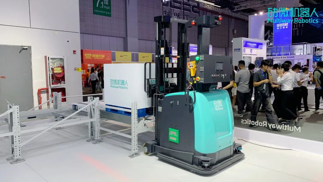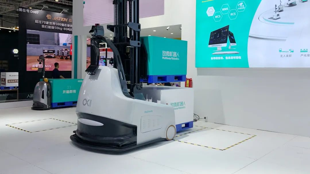 展会现场,业界首创单次两托「劢微α2」获众多瞩目,该车型采用“双托盘+双升降”结构,集前移式、托盘式、堆高式无人叉车优势于一体,可以从容应对各类复杂场景,保证长时间高效稳定运行。