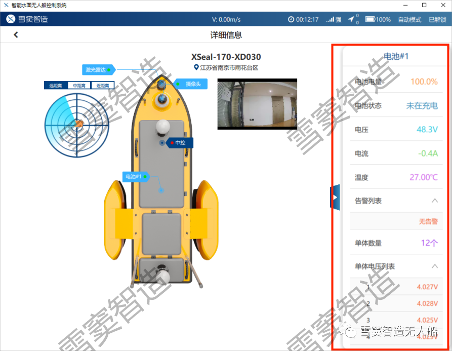 雪窦智造自主研发的无人船操作系统,充分发挥了移动互联网与智能终端的便捷性、高性能。为使用人员提供了一个操作简单明了的APP,通过该App可以实现无人船远程控制、船体状态概览、巡查路线设置、信息推送、实时监控、巡查日志查看等。支持在平板电脑和智能手机上的的安装使用,实现水质监测巡查无人船服务的数据查看和远程控制等应用。