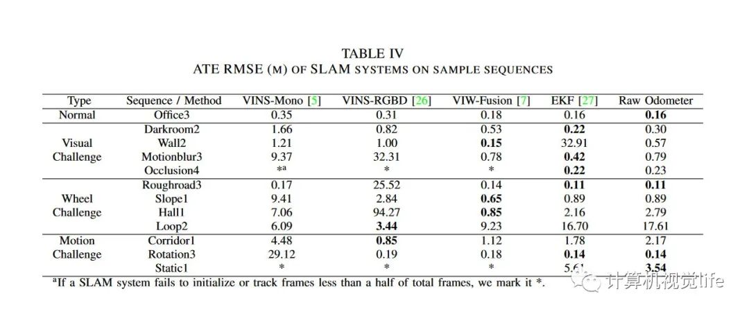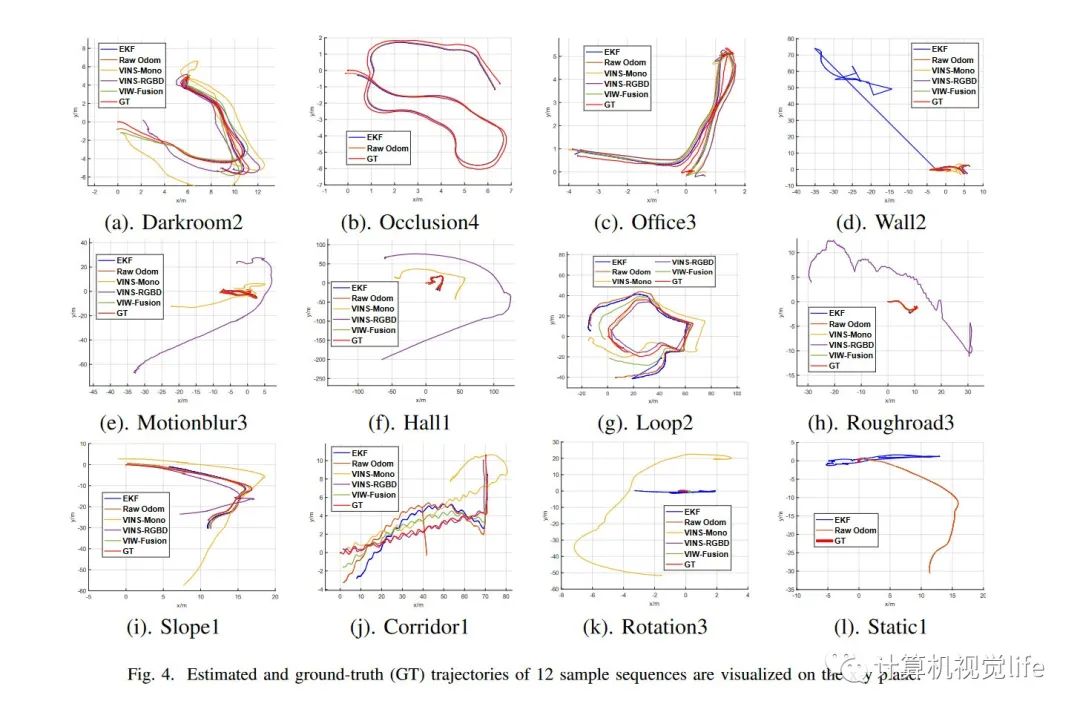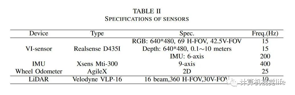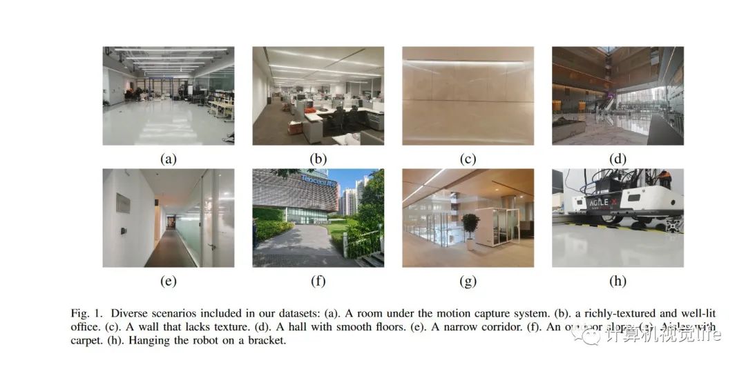 高质量的数据集可以加快SLAM研究的突破,并揭示其潜在的发展方向。为了支持视觉SLAM系统中角点情况的研究,本文提出了Ground - Challenge:一个具有挑战性的数据集,该数据集包含36条具有不同角点情况的轨迹,如激烈运动、严重遮挡、光照变化、纹理较少、纯旋转、运动模糊、车轮悬浮等。该数据集由包含RGB - D相机、惯性测量单元( inertial measurement unit,IMU )、轮式里程计和三维激光雷达的地面机器人采集。所有这些传感器都进行了良好的校准和同步,并同时记录了它们的数据。