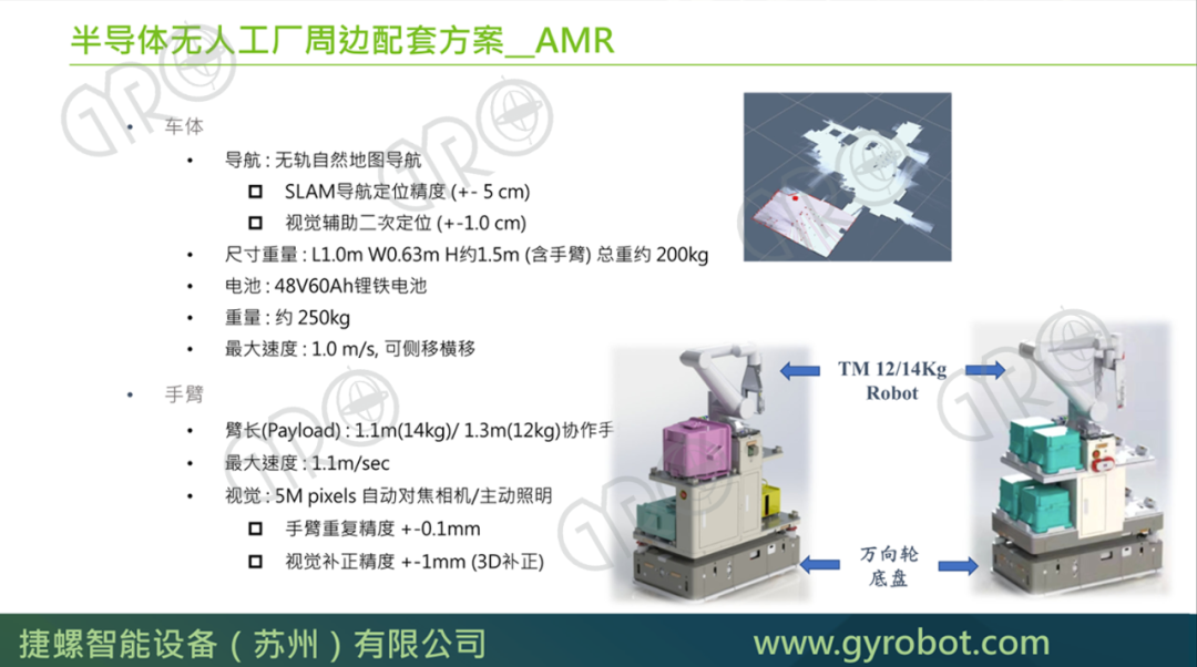 捷螺通过自主研发AMR,在此基础之上可对车辆进行客制化调校。捷螺机器人采用万向轮和激光雷达导航,使用自研技术进行二次定位,配合协作机器人的视觉系统,搭配半导体同业内唯一可以自动换电的换电站,从而实现安全、精准和高效率。
