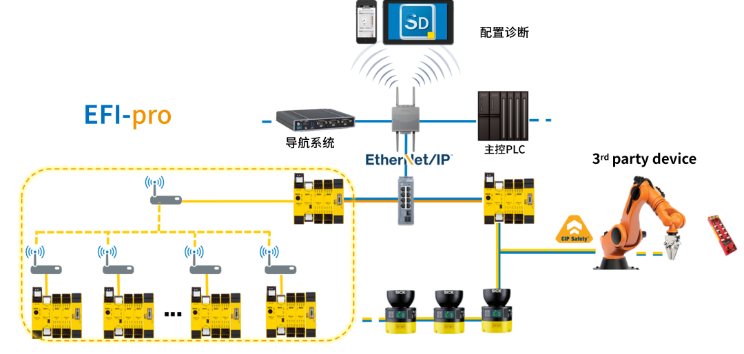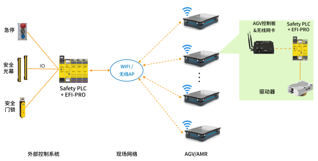 安全控制器接收到外部安全信号后,通过EFI-PRO网关借助现场无线网络,发送给AGV/AMR上的安全控制器,最终实现安全停止控制。