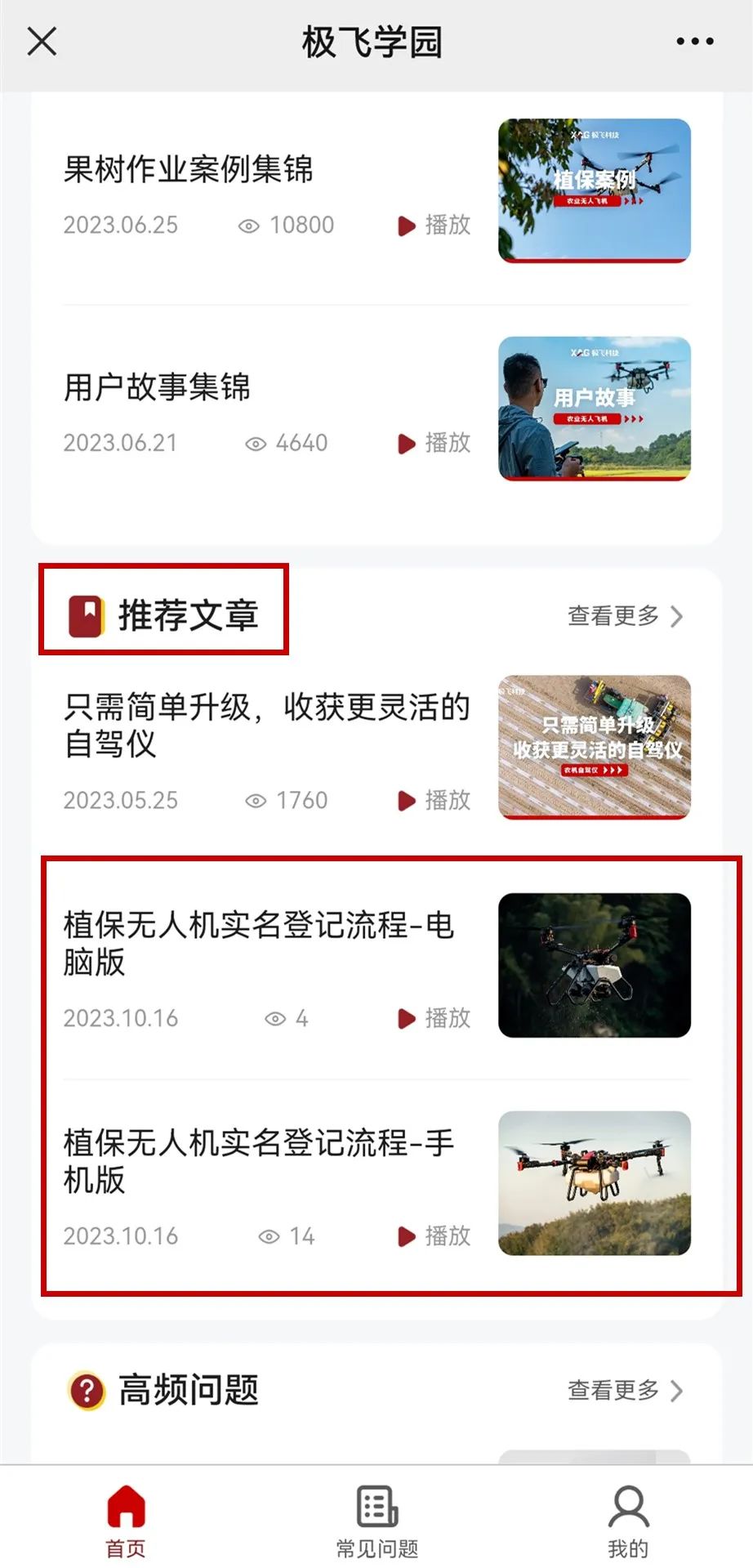 为了让大家更加清楚登记流程,极飞学园已经上线相关操作教程。在首页向下滑动,在“推荐文章”处即可点击查看。(点击下方“阅读原文”也可直接跳转)