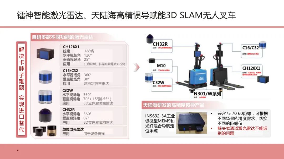 在论坛分享会上介绍了无人叉车配置的技术领先全球的镭神智能激光雷达系列产品,解决了卡脖子难题,实现国产化自主可控,每台无人叉车周身配置7-8颗激光雷达,提供丰富稳定的全方位立体感知信息,做到更安全、更稳定、更可靠。