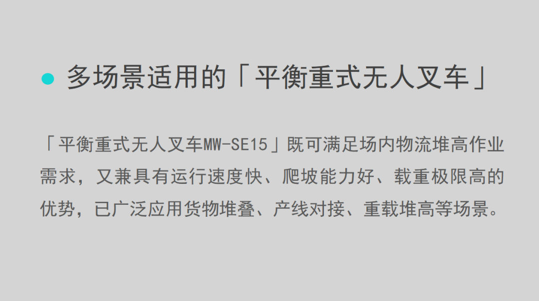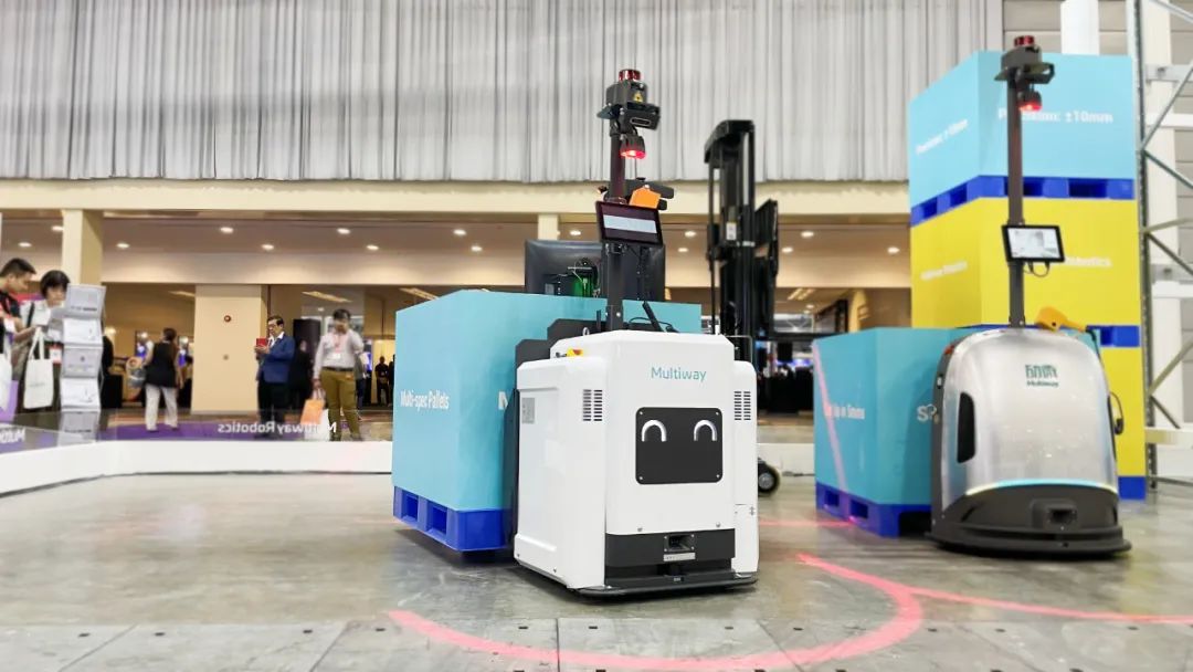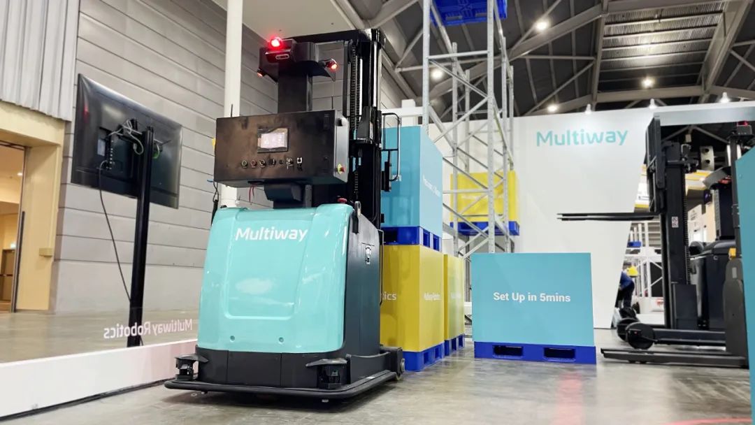 展会现场,无损兼容田字托盘的「微蜂X20S」水平搬运田托货物,开箱即用的无人叉车「劢小微X1」进行点对点平面搬运作业,「平衡重式无人叉车MW-SE15」展示高精度三层货物堆叠,「前移式无人叉车MW-R16」进行高位货架货物的垂直转移。
