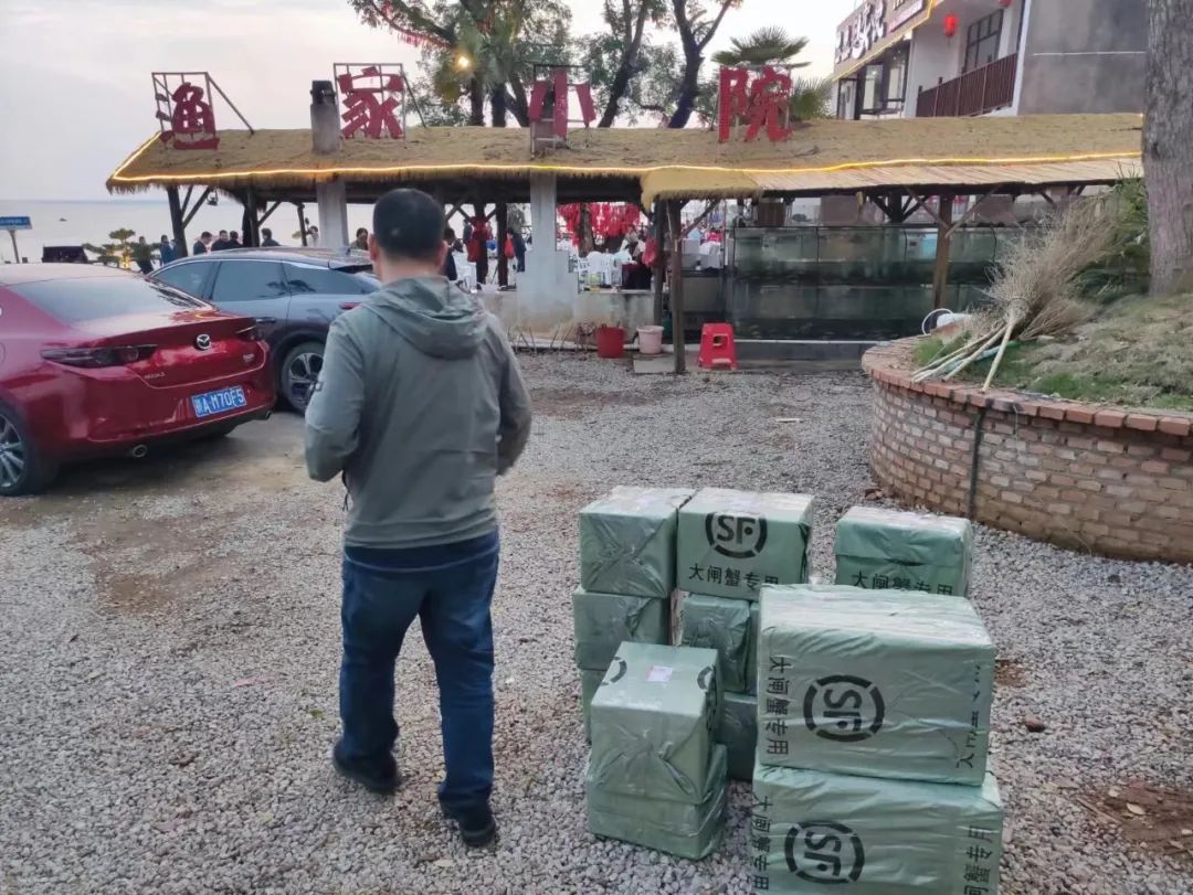 ▲鲜活的大闸蟹装箱,用无人机运至餐厅