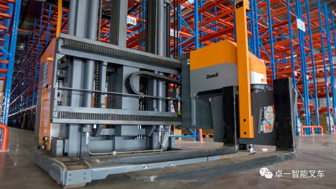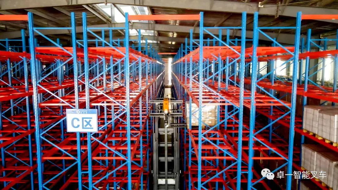 在进行多方考察后,该企业最终选择了卓一智能叉车提供的窄巷道方案,卓一以最大载重1600kg,最大起升高度9500mm的人下行三向叉车为企业高密仓储、高效堆垛需求助力。
