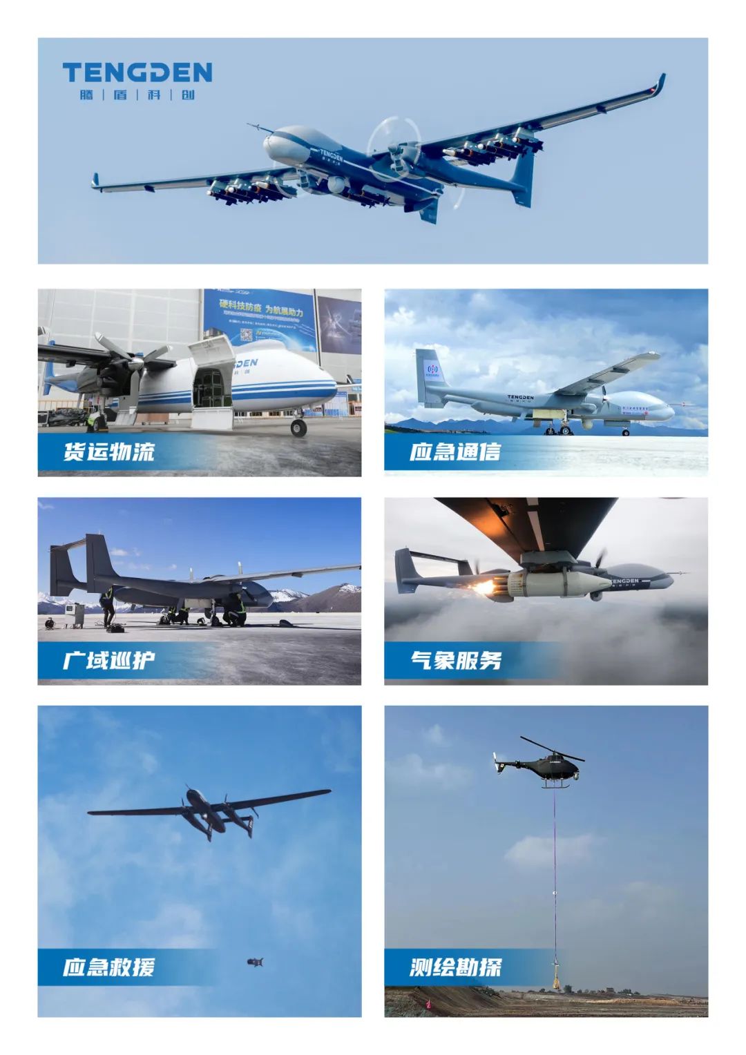 腾盾科创成立近8年来,已成功打造多款大型高端商用无人机品牌,推出双尾蝎系列、扑天雕、混江龙、没羽箭等10余款无人机产品,开创了“上山”、“下海”、“追风”、“弄云”、“定火”、“传书”等经典的应用案例,有力推动了我国无人机技术和产业的整体提升。