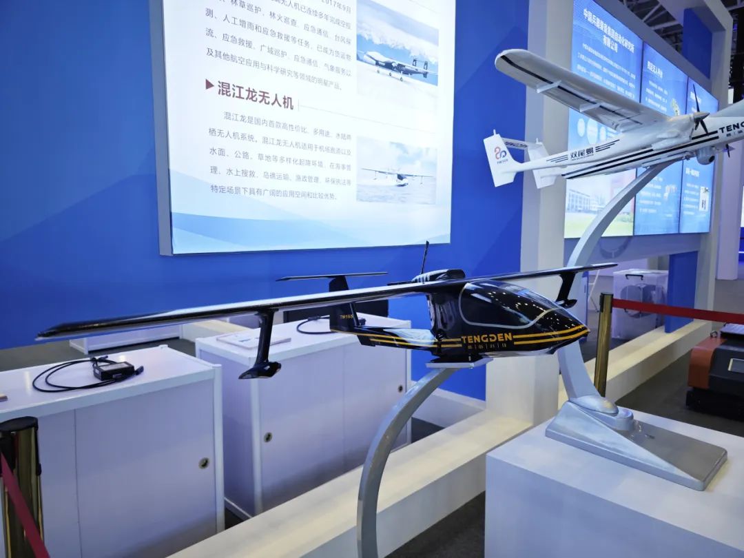 展出的第二架混江龙是国内首款多用途、水陆两栖轻型无人机,适用于机场跑道以及水面、公路、草地等多样化起降环境,在海事管理、水上搜救、岛礁运输、渔政管理、环保执法等特定场景下具有广阔的应用空间。