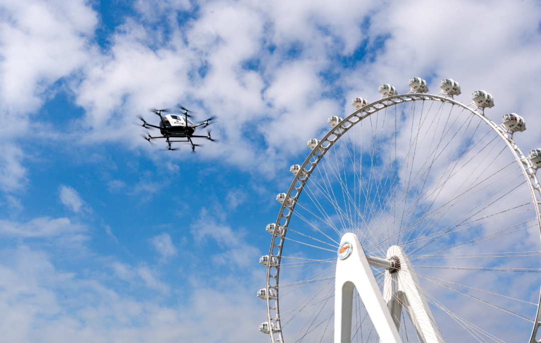 在今天的UAM中心启动活动上,EH216-S在欢乐港湾上空完成了演示飞行,当地政府官员、民航监管机构、企业代表和市民在现场见证了飞行。