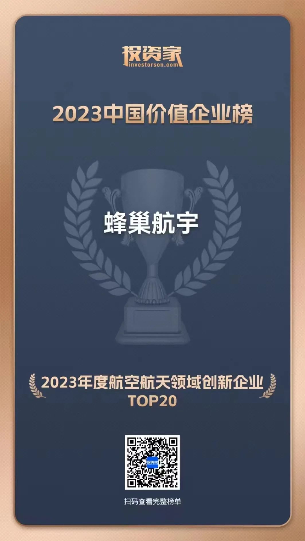 2023年12月,投资家网发布“2023中国价值企业榜”,该榜单从成长、创新、融资、专利、活跃、影响力等维度,结合投资家网WFin数据库,从3500多家申报企业中评选出各领域最具前沿科技代表性的企业。本次蜂巢航宇获评“2023中国价值企业榜”「航空航天领域创新企业TOP20」。