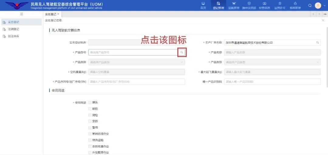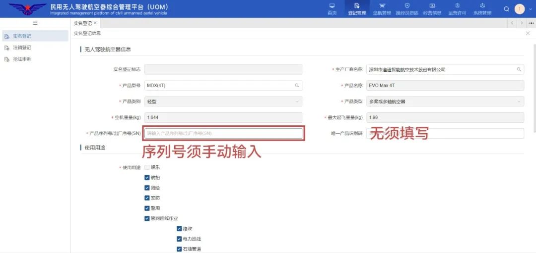 ▼平台将自动填充表格中的产品名称、产品类别、空机重量(kg)、最大起飞重量(kg)信息,手动输入您无人机的[产品序列号/出厂序号(SN)](序号列查询方式可参照后文),[唯一产品识别码] 无须填写,其次结合自身使用情况勾选无人机[使用用途]。