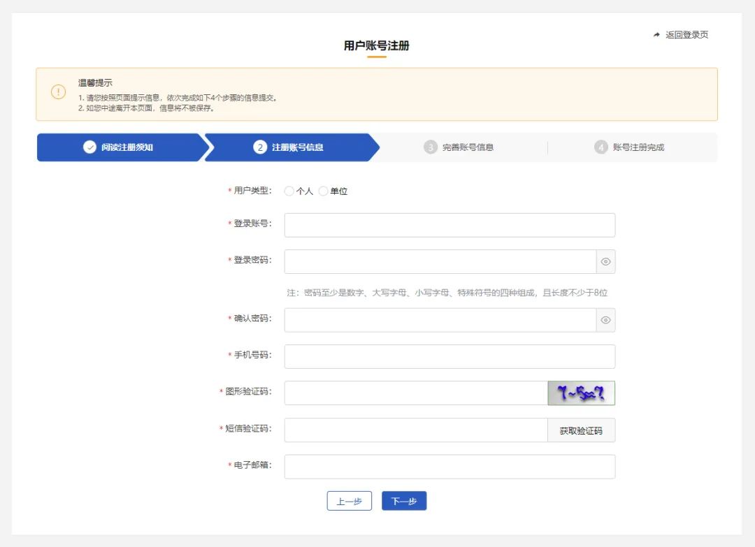 ▼填写注册账号信息,包含:用户类型、登录账号、登录密码、确认密码、手机号码、图形验证码、短信验证码、电子邮箱,填写完成后点击 [下一步] 按钮。
