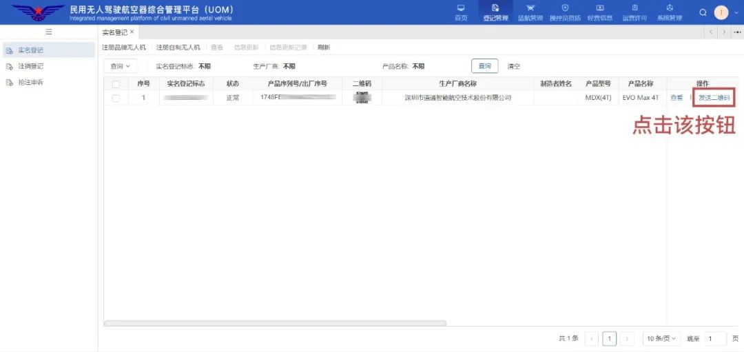 完成注册后,可在实名登记页面中查询到已完成注册登记的无人机,点击右侧[发送二维码] 按钮。