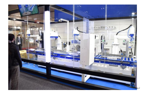 在展会上,通过将三个机器人系统与辊筒输送机和其他设备相结合,展示了从拆垛、切割纸箱顶部的胶带、切割纸箱顶盖(挡板)到开箱的一系列操作。