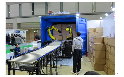 2023 年日本国际机器人展览会上备受关注的机器人系统之一是用于卸载集装箱的拆箱机器人