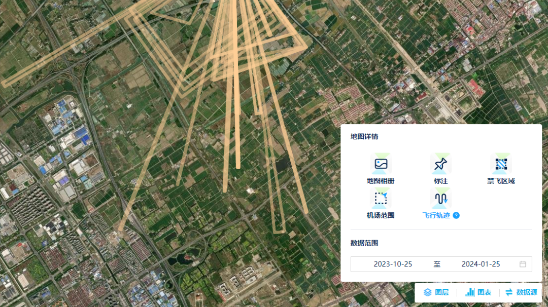 此外历史飞行轨迹页面页面还进行了多元信息汇总展示,涵盖地图相册、禁飞空域、点线面的人工标注、最新实采地图映像、三维模型、高程数据、机场覆盖范围等信息,有效辅助任务管理和综合分析决策。