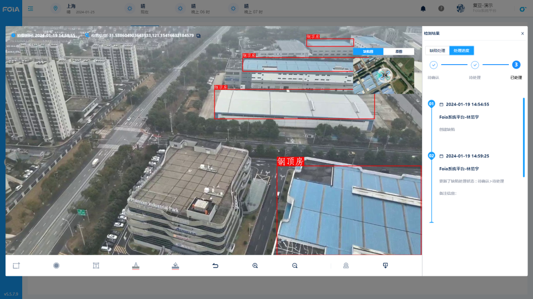 ■飞行中实时识别:在巡视过程中,自动实时识别并显示在平台上,对识别到的异常会立即记录,进行即时告警,相较于先采后识别,干预更及时。