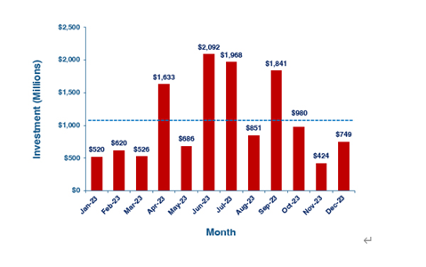 2023 年的机器人资金总额约为 129 亿美元(下图 1)。在此期间,平均每月的机器人投资约为 10.7 亿美元。2023 年 11 月的投资额为 4.18 亿美元。您可在此阅读《机器人报告》的所有投资报道。