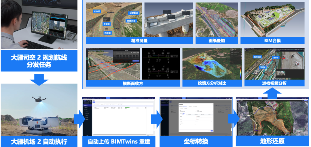 为了更好地利用无人机数据,为工程建筑领域提供更智慧的管理,基于司空 2 云端互联功能,广联达科技股份有限公司研发 BIMTwins 工具,与大疆机场 2 进行打通,帮助用户低成本、高效率、易入门地使用高精地图、三维模型和测量数据。